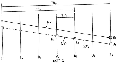 Как показано на фиг.3, если вектор движения вперед режима прямого предсказания получают с использованием известных средств, блок с компенсацией движения Bf находится в предыдущем опорном кадре для режима прямого предсказания (Р1), а блок с компенсацией движения Вb находится в последующем опорном кадре для режима прямого предсказания (Р7), то осуществляют интерполяционное предсказание по уравнению (5). В данном случае TRD – временной интервал между предыдущим опорным кадром для режима прямого предсказания (Р1) и последующим опорным кадром для режима прямого предсказания (Р7), a TRB – временной интервал между предыдущим опорным кадром для режима прямого предсказания (Р1) и текущим В-кадром (В5). В частности, способ интерполяционного предсказания включает в себя те же усредняющие вычисления, что и известные средства, на тот случай, если В-кадр расположен в центре между предыдущим опорным кадром для режима прямого предсказания и последующим опорным кадром для режима прямого предсказания.
