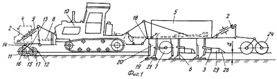 Впереди трактора расположена несущая система 1, а позади несущая система 18. Несущая система 1 с дисками 15, 17 двухследных батарей 11, 12 соединена шарнирно через поводки 13 и дополнительно связана через пружины 14. Плоские диски 15 снабжены ребордами 16 для ограничения глубины хода, а диски 17 снабжены сферическими зубьями для образования фракций почвы мелкозернистой структуры. Плоские диски 15 располагаются впереди между зубчатыми дисками 17. На несущей системе 18 расположен над лапами 19 ящик 5, а с тыльной стороны стойки 20 – семяпровод 6 с рассеивателями 21 семян под лапой 19 и рыхлителями. Позади этих рабочих органов размещен закрепленный на стойке 20 фронтальный выравниватель 3 с гребенкой 22 для мульчирования, снабженный -образно расположенными выравнивателями 23. Уплотнитель 24 с механизмом регулирования 25 установлен на задней части несущей системы 18.