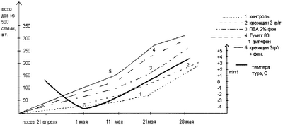 В вариантах без ПВА, а также только с ПВА резкое повышение всхожести наблюдается после 21 мая, когда минимальная температура не опускается ниже +4°.