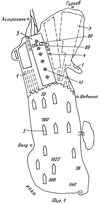 на фиг.1 приведен план размещения прудов, прудовых хозяйств, садков и бассейнов в них в Северней части Каспийского моря. В Среднем и Южном Каспии условно показано размещение плавучих волновых электростанций (ПВЭС),