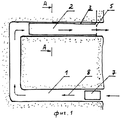 Для осуществления способа на берегу озера строят обводной канал 1 в соответствии с фиг.1. В него ставят ловушку 2, состоящую из четырех боковых стенок 3 и дна 4, причем верхние подборы двух продольных и одной поперечной задней стенки приподняты над поверхностью воды, а верхняя подбора поперечной передней стенки 5 опущена в толщу воды и образует вход для рыбы. Корм раздают на половине или на 2/3 части ловушки, начиная от поперечной задней стенки. Чтобы исключить просеивание корма через дно ловушки, его покрывают кормонепроницаемым полотном 6. Корм раздают ежедневно в одно и тоже время. Перед началом раздачи корма включают в работу аэратор-потокообразователь 7, например турбоаэратор Н19-ИАЛ конструкции ФГУП “Госрыбцентр” мощностью 0,5 кВт. Поток воды 8 аэратора-потокообразователя освобождает кормовую дорожку от закисших остатков корма, улучшает газовый режим на кормовой дорожке, увеличивает аппетит у рыбы (поедаемость корма) и помогает отыскивать место кормления.