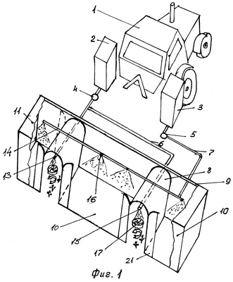 При движении агрегата 1 тоннельные укрытия 8 надвигаются на рядки растений, а междурядья попадают под укрытия, образуемые с боковых сторон передвижными перегородками 10 и сверху съемной крышкой 11 каркаса. Препараты из резервуаров 2 и 3 по трубопроводам 6 и 7 нагнетаются компрессорами 4 и 5 и поступают под давлением во внутреннее пространство укрытий над рядками растений и междурядий. Внутри укрытий жидкостные потоки препаратов через распределительные трубопроводы 13 и 14 и форсунки 15 и 16 распыляются над рядками растений и междурядий. Для усиления распыла препаратов над рядками растений (фиг.2) жидкостные потоки препаратов, проходя через ротационные распылители 17 лопастного типа, закручиваются внутрь его крыльчатками 18 и обечайками 20, образуя на выходе над растениями туман с турбулентно-вихревым движением. В результате этого движения препараты обволакивают части растений (стебли, листья) со всех сторон и полностью используются при обработке, исключая загрязнение окружающей среды. При химической обработке однородными препаратами, например гербицидами, одновременно в рядках до всходов культурных растений и в междурядьях (фиг.4, б) откидные створки 21 с торцевых сторон тоннельного укрытия 8 закрываются, исключая тем самым загрязнение окружающей среды и влияние на здоровье обслуживающего персонала.