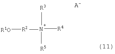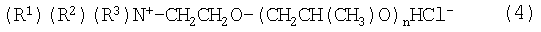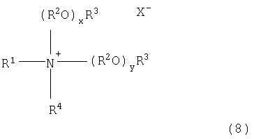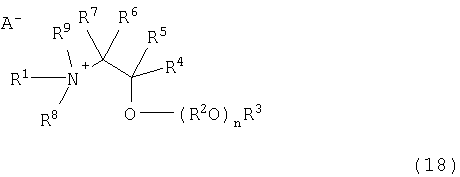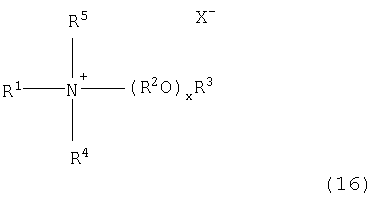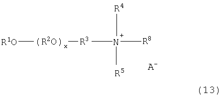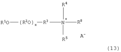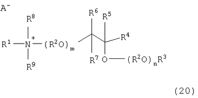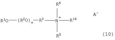где R1 и R4 представляют, независимо, гидрокарбильные или замещенные гидрокарбильные группы, имеющие от 1 до приблизительно 30 атомов углерода, или -R5SR6, R2 в каждой из групп x(R2O) представляет, независимо, С2-С4-алкилен, R3 представляет водород или неразветвленную или разветвленную алкильную группу, имеющую от 1 до приблизительно 4 атомов углерода, R5 представляет неразветвленную или разветвленную алкильную группу, имеющую от приблизительно 6 до приблизительно 30 атомов углерода, R6 представляет гидрокарбильную или замещенную гидрокарбильную группу, имеющую от 4 до приблизительно 15 атомов углерода, и х равно среднему числу от 1 до приблизительно 60. В данном контексте предпочтительные гидрокарбильные группы R1, R4 и R6 представляют неразветвленные или разветвленные алкильные, неразветвленные или разветвленные алкенильные, неразветвленные или разветвленные алкинильные, арильные или аралкильные группы. В одном варианте осуществления R1 включает от приблизительно 7 до приблизительно 30 атомов углерода, предпочтительно, от приблизительно 8 до приблизительно 22 атомов углерода и остальные группы имеют значения, описанные выше. Предпочтительно, R1 и R4 представляют, независимо, неразветвленную или разветвленную алкильную или неразветвленную или разветвленную алкенильную группу, имеющую от 1 до приблизительно 25 атомов углерода, R2 в каждой из групп x(R2O) представляет, независимо, С2-С4-алкилен, R3 представляет водород, метил или этил и х равно среднему числу от 1 до приблизительно 40. Более предпочтительно, R1 и R4 представляют, независимо, неразветвленную или разветвленную алкильную группу, имеющую от 1 до приблизительно 22 атомов углерода, R2 в каждой из групп x(R2O) представляет, независимо, этилен или пропилен, R3 представляет водород или метил, и х равно среднему числу от 1 до приблизительно 30. Еще более предпочтительно, R1 представляет неразветвленную или разветвленную алкильную группу, имеющую от приблизительно 8 до приблизительно 22 атомов углерода, и R4 представляет неразветвленную или разветвленную алкильную группу, имеющую от 1 до приблизительно 22 атомов углерода, R2 в каждой из групп x(R2O) представляет, независимо, этилен или пропилен, R3 представляет водород или метил, и х равно среднему числу от приблизительно 1 до приблизительно 10. Наиболее предпочтительно, R1 представляет неразветвленную или разветвленную алкильную группу, имеющую от приблизительно 16 до приблизительно 22 атомов углерода, и R4 представляет метил, R2 в каждой из групп x(R2O) представляет этилен, R3 представляет водород и х равно среднему числу от приблизительно 1 до приблизительно 5 или R1 представляет неразветвленную или разветвленную алкильную группу, имеющую от приблизительно 8 до приблизительно 15 атомов углерода, и R4 представляет метил, R2 в каждой из групп x(R2O) представляет этилен, R3 представляет водород, и х равно среднему числу от приблизительно 5 до приблизительно 10. (g) Моноалкоксилированные четвертичные аммониевые соли, имеющие формулу: