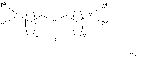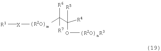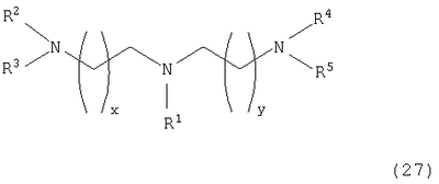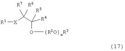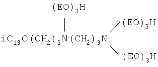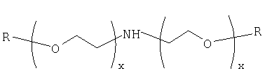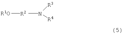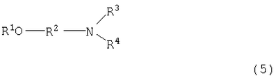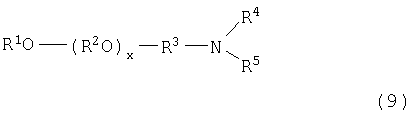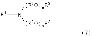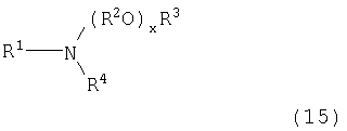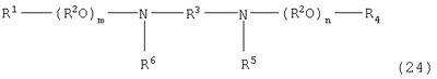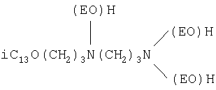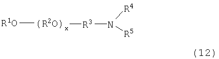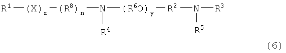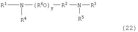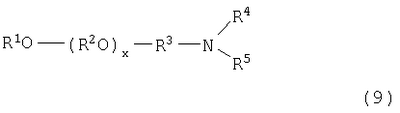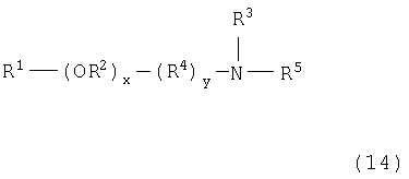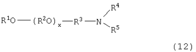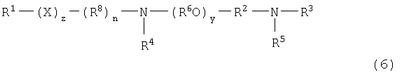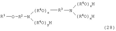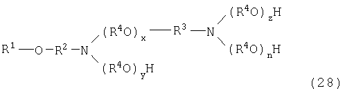 где R1 и R3 представляют, независимо, водород, гидрокарбил или замещенный гидрокарбил, имеющий от 1 до приблизительно 30 атомов углерода, R2 в каждой из групп x(R2O) представляет, независимо, С2-С4-алкилен, R4 представляет гидрокарбилен или замещенный гидрокарбилен, имеющий от 1 до приблизительно 30 атомов углерода, R5 представляет гидроксиалкил, полигидроксиалкил или поли(гидроксиалкил)алкил; х равно среднему числу от 0 до приблизительно 30 и у равно 0 или 1. В данном контексте предпочтительные гидрокарбильные (гидрокарбиленовые) группы R1, R3 и R4 представляют неразветвленную или разветвленную алкильную (алкиленовую), неразветвленную или разветвленную алкенильную (алкениленовую), неразветвленную или разветвленную алкинильную (алкиниленовую), арильную (ариленовую) или аралкильную (аралкиленовую) группу. (f) Моноалкоксилированные амины, имеющие формулу:
