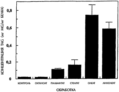Как следует из чертежа, не наблюдалось накопления IMCL в клетках, подвергавшихся воздействию среднецепочечной жирной кислоты октаноата (сравнимо с контрольной средой без этой жирной кислоты), тогда как значительное накопление наблюдалось при инкубации с длинноцепочечной жирной кислотой. Насыщенные жирные кислоты пальмитат и стеарат вызывали умеренный синтез без особых различий между ними. Напротив, заметно более высокий синтез наблюдался при использовании ненасыщенных жирных кислот олеата и линолеата по сравнению с насыщенными жирными кислотами (в 2,5-4 раза выше).