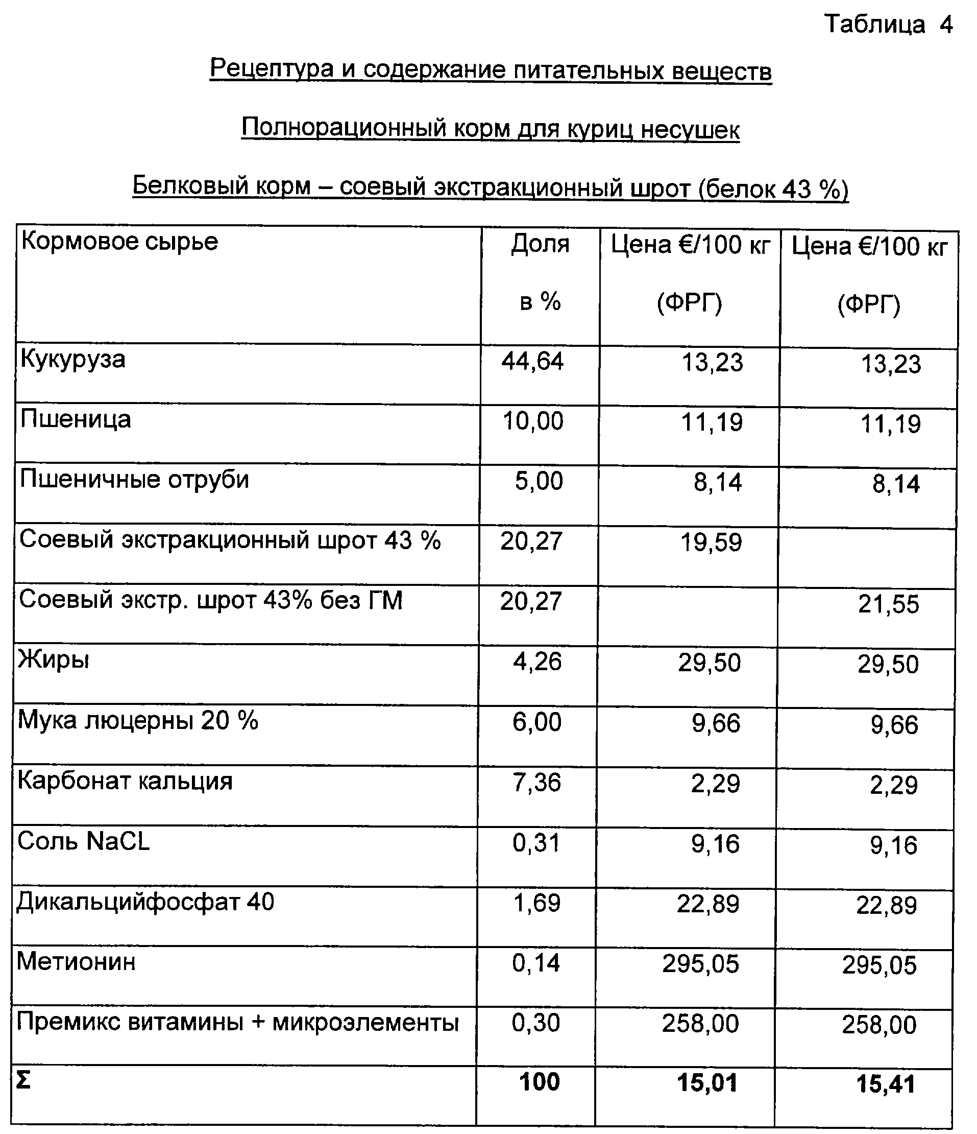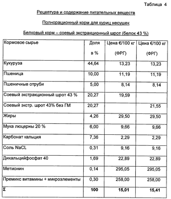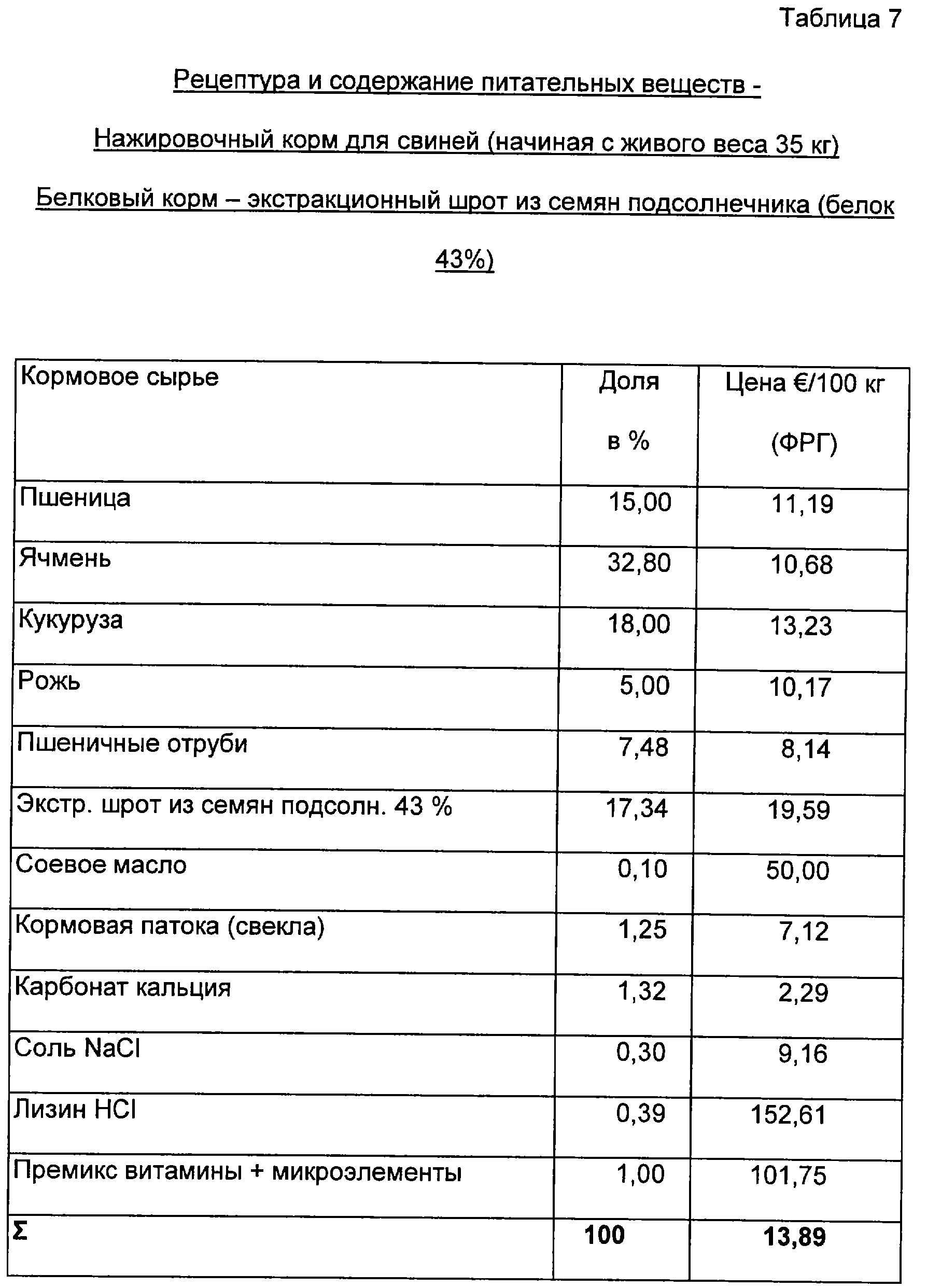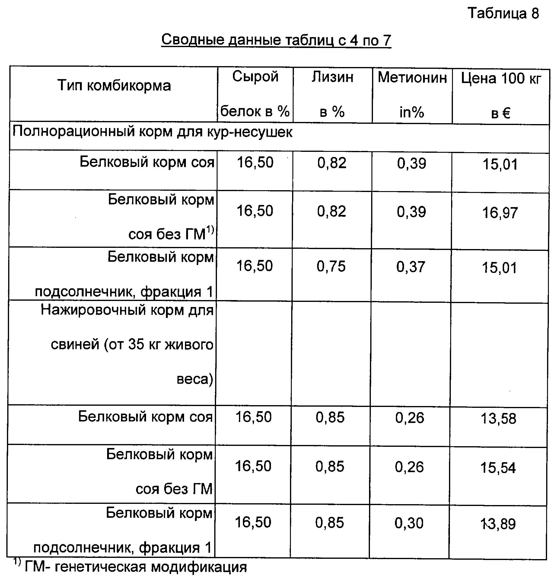 можно рассчитать оптимальную рецептуру комбикорма, основанную на ценовой экономии и одновременно соответствующую нормам потребления. Ниже поясняется использование полученной согласно данному изобретению фракции с высоким содержанием белка в рецептурах комбикормов для куриц-несушек и свиней. Приведенные ниже модели калькуляций в таблицах с 4 по 7 показывают, что новый продукт – экстракционный шрот семян подсолнечника, фракция 1 – в качестве белкового корма для птицы и свиней равноценен лидеру рынка соевому экстракционному шроту, если оставить без внимания аспект генетической модификации. Однако экстракционный шрот семян подсолнечника, фракция 1, не являющийся генетически модифицированным, оказывается на 10% дешевле, если делать калькуляцию в сравнении с соевым экстракционным шротом, тоже не являющимся генетически модифицированным. Для большей наглядности важные калькуляционные показатели таблиц 4-7 сведены в таблице 8. Выводы таковы: