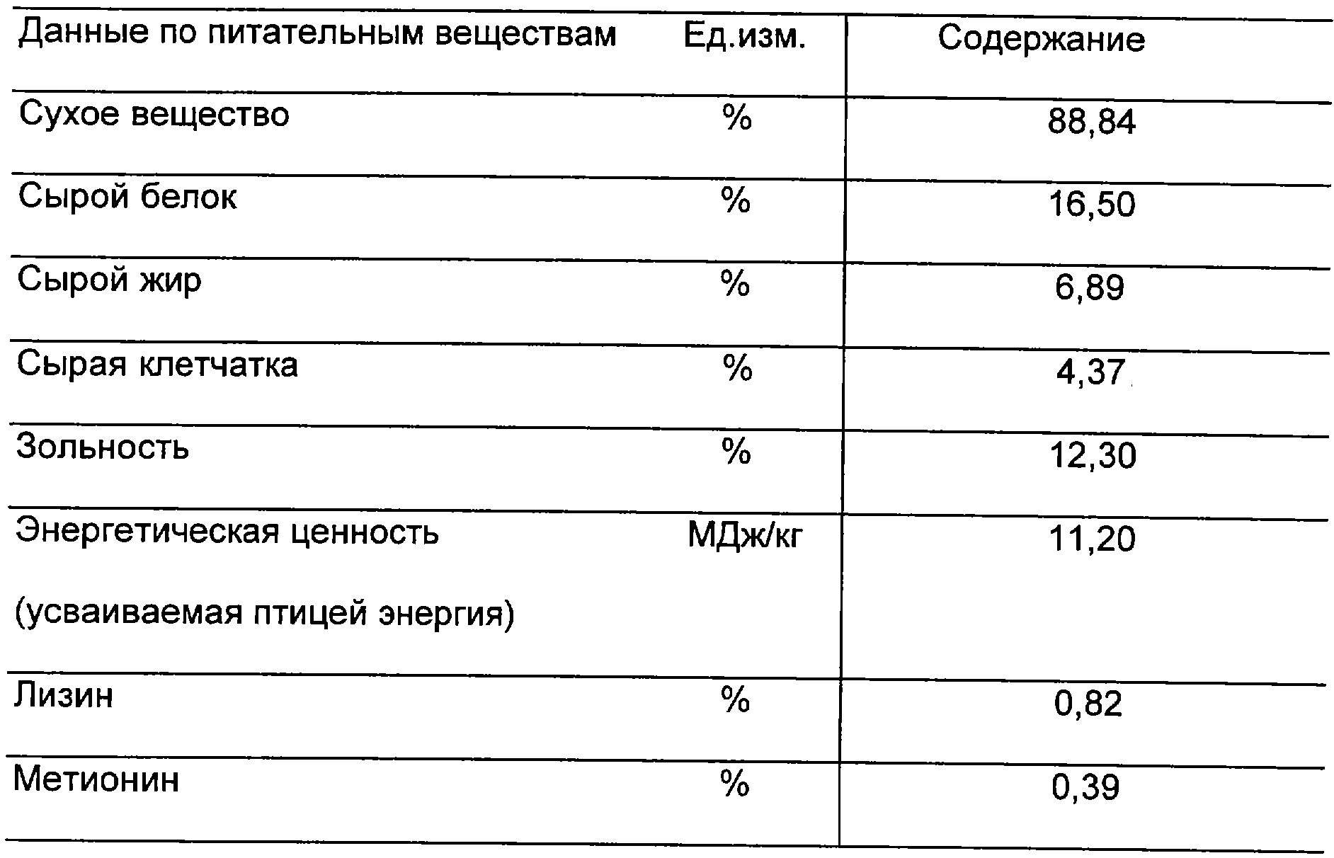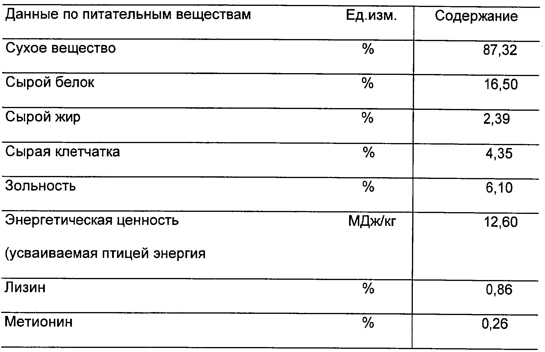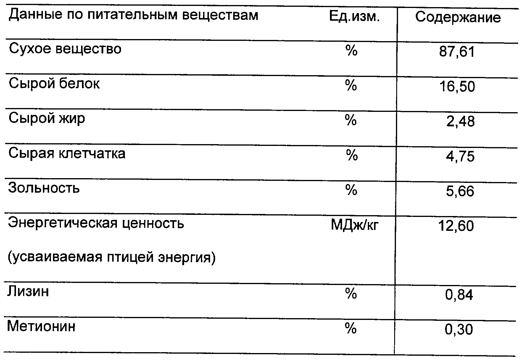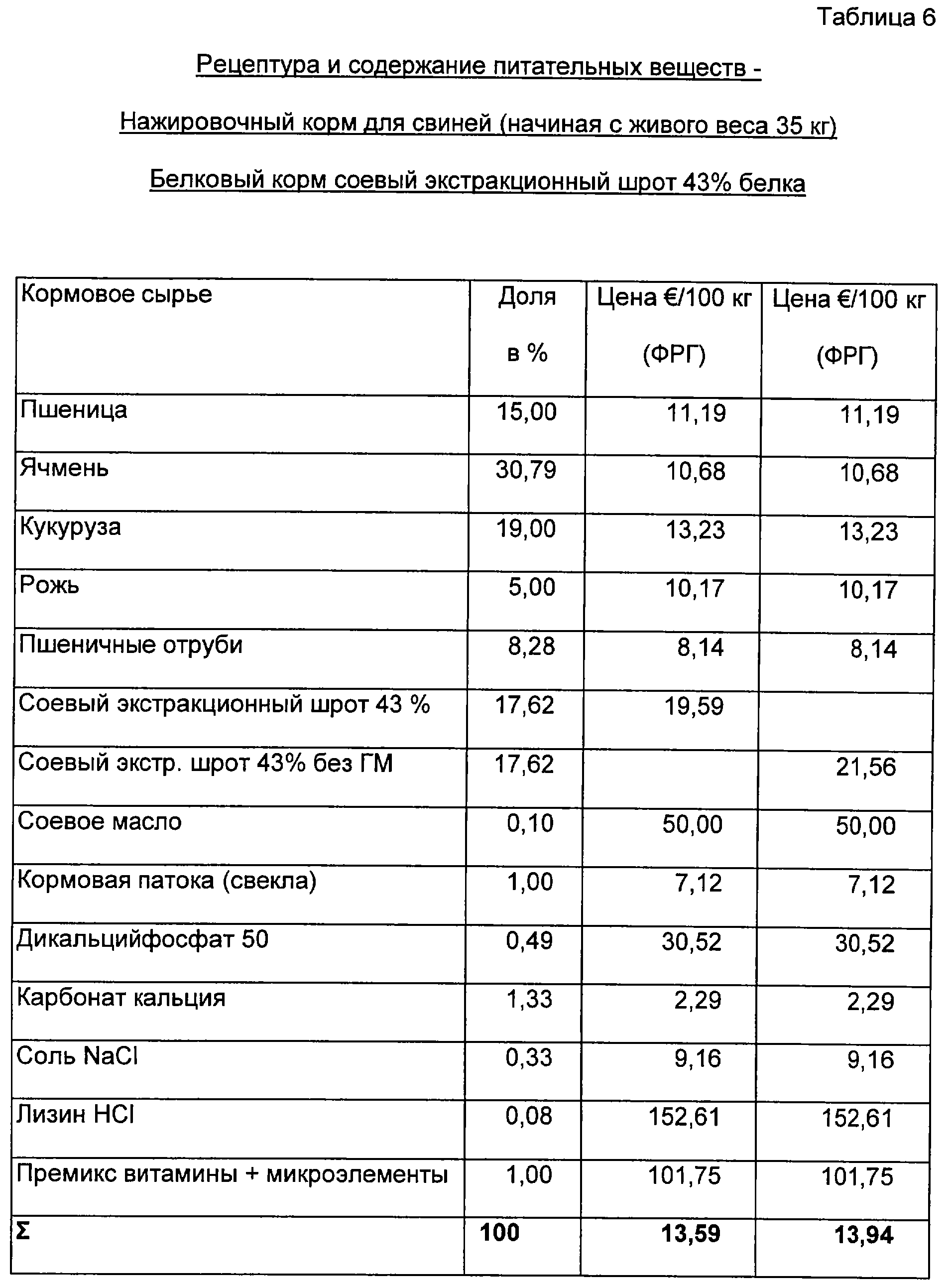 можно рассчитать оптимальную рецептуру комбикорма, основанную на ценовой экономии и одновременно соответствующую нормам потребления. Ниже поясняется использование полученной согласно данному изобретению фракции с высоким содержанием белка в рецептурах комбикормов для куриц-несушек и свиней. Приведенные ниже модели калькуляций в таблицах с 4 по 7 показывают, что новый продукт – экстракционный шрот семян подсолнечника, фракция 1 – в качестве белкового корма для птицы и свиней равноценен лидеру рынка соевому экстракционному шроту, если оставить без внимания аспект генетической модификации. Однако экстракционный шрот семян подсолнечника, фракция 1, не являющийся генетически модифицированным, оказывается на 10% дешевле, если делать калькуляцию в сравнении с соевым экстракционным шротом, тоже не являющимся генетически модифицированным. Для большей наглядности важные калькуляционные показатели таблиц 4-7 сведены в таблице 8. Выводы таковы: