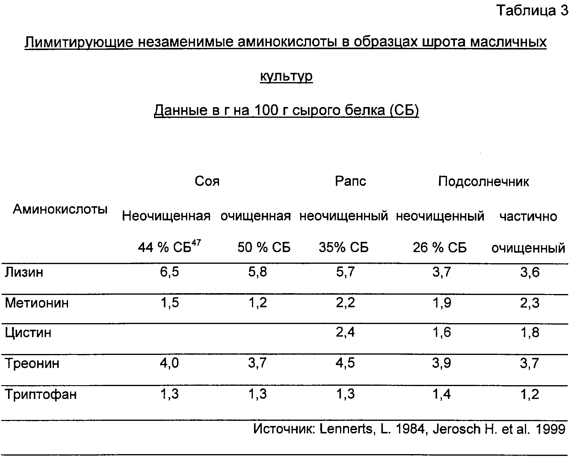 Решающим для показателя содержания белков является для незаменимых аминокислот в них, в частности лизина, метионина и цистина, треонина и триптофана. В таблице 3 приведены данные содержания лимитирующих незаменимых аминокислот в экстракционных шротах в граммах на 100 г сырого белка.