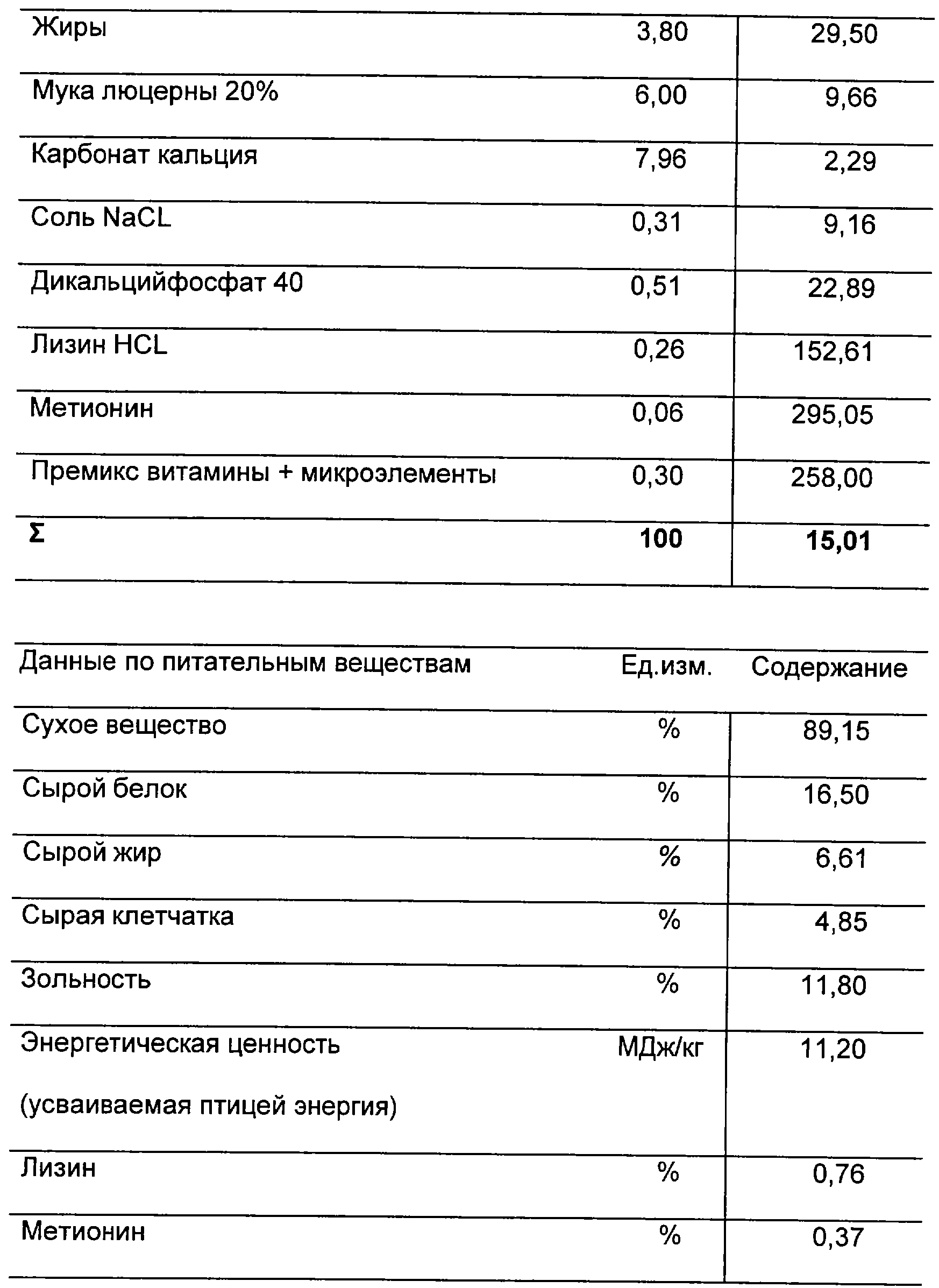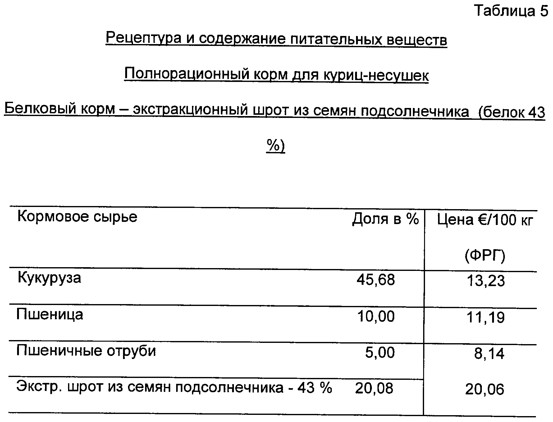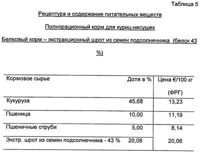 Обе фракции, получаемые согласно данному изобретению из экстракционного шрота семян подсолнечника, могут также в промышленном масштабе использоваться в качестве кормовой добавки в рецептах комбикормов в соответствии с нормами потребления, установленными для разных видов и классов продуктивности. При этом фракции, полученные согласно данному изобретению из экстракционного шрота семян подсолнечника, будучи высококачественной кормовой добавкой, могут составлять ценную долю рациона животных и являться заменой соевым кормам, исключая необходимость использования продуктов, полученных из генетически модифицированных сортов. Ниже приводятся несколько моделей калькуляций для комбикормов, в основу которых положены действующие цены на кормовое сырье в Германии.