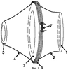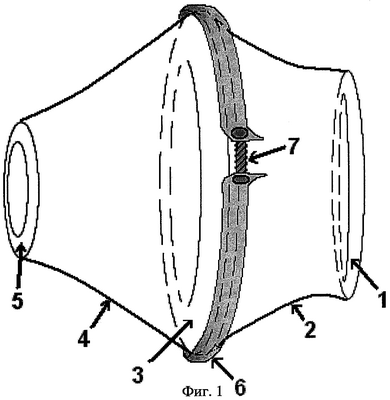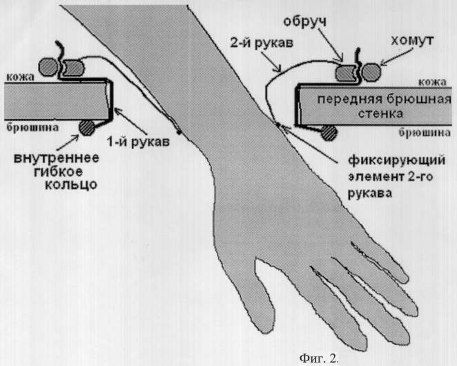 От гибкого кольца (1) круглого сечения внутренним диаметром не менее 8 см начинается первый эластичный рукав (2) длиной не менее 7 см. От жесткого обруча (3) диаметром 10-11 см начинается второй эластичный рукав (4) длиной не менее 15 см, заканчивающийся фиксирующим элементом, например уплотнительным буртиком (5), диаметр рукава на уровне фиксирующего элемента 4-6 см. На обруче установлен с возможностью съема хомут (6) – незамкнутое кольцо из плотного тугоэластичного материала, концы которого соединены посредством винта (7), позволяющего сближать их. Между обручем и хомутом размещен свободный край первого эластичного рукава (начинающегося от внутреннего кольца). При необходимости, ослабив винт хомута, возможна фиксация первого эластичного рукава между обручем и хомутом на разных уровнях, тем самым можно изменять расстояние между внутренним кольцом и обручем в зависимости от толщины передней брюшной стенки пациента.