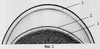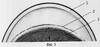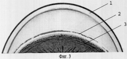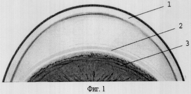 Заявляемый способ поясняется чертежами, на которых представлена гониоскопическая картина шлеммова канала, где на фиг.1 – отсутствие заполнения кровью шлеммова канала (1 – роговица; 2 – шлеммов канал, не заполненный кровью; 3 – радужка), на фиг.2 – заполнение шлеммова канала по всей окружности в виде гомогенной линии (1 – роговица; 2 – шлеммов канал, равномерно заполненный кровью; 3 – радужка), на фиг.3 – заполнение шлеммова канала в виде неравномерно окрашенных сегментов с тенденцией к слиянию (1 – роговица; 2 – шлеммов канал, частично заполненный кровью; 3 – радужка).