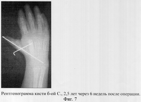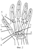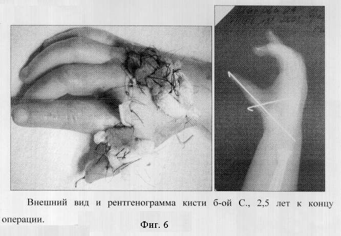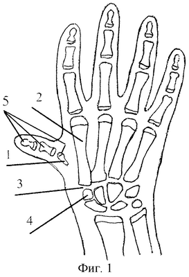 На фиг.2 представлено продольное расщепление второй пястной кости 2, запястно-пястного сустава второго пальца 3 и малой многоугольной кости 4 на ульнарную и радиальную половины, сопоставление радиального фрагмента пястной кости 6 с рудиментом первой пястной кости 1.