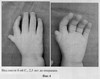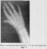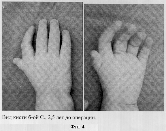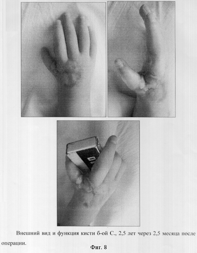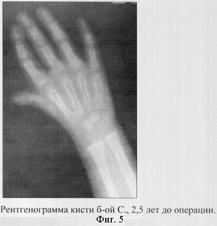 Б-я С., 2 лет, поступила на лечение в ФГУ НИДОИ им. Г.И.Турнера с диагнозом: Врожденная гипоплазия первого пальца правой кисти. Клинически отмечалось недоразвитие первого пальца, его приведение, отсутствие оппозиции к трехфаланговым пальцам, а также полное выпадение функции двустороннего схвата кисти (фиг.4). Рентгенологическое обследование выявило недоразвитие фаланг большого пальца, а также отсутствие проксимальной трети пястной кости 1 (фиг.5). Нами выполнена реконструкция первого луча правой кисти по предложенной методике (фиг.6). Рентгенограмма кисти через 6 недель после операции (фиг.7). Внешний вид и функция кисти через 2,5 месяца после операции (фиг.8).