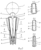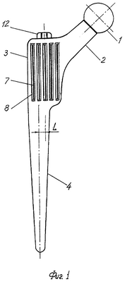 Эндопротез содержит головку 1, шейку 2, вертельный отдел 3 и ножку 4. Корпус вертельного отдела 3 и проксимальной части ножки 4 выполнен в виде полого четырехгранного клина, поперечное сечение которого имеет форму равнобочной трапеции, большее основание 5 которой обращено в латеральную сторону. На малых основаниях 6 трапеций, обращенных в медиальную сторону, установлена своим основанием шейка 2. В полости корпуса расположены ребра 7, имеющие сечения в форме равнобочной трапеции. Ребра 7 уменьшаются по высоте в своих дистальных отделах и в медиальном направлении. Они размещены в полости корпуса таким образом, что их наружные кромки располагаются в сквозных, продольных пазах 8, выполненных в передней и задней стенках корпуса. Наружные кромки ребер, представляющие собой малые основания трапеций их сечения, в исходном положении не выступают над поверхностью корпуса. Своими большими основаниями трапеций сечений ребра 7 закреплены на свободных верхних концах плоских пружин, каждому ребру 7 соответствует плоская пластинчатая пружина 9. Нижними концами пружины 9 расположены попарно, V-образно и закреплены в дне корпуса. Между всеми парами V-образно установленных пружин размещен во фронтальной плоскости толкатель 10 в виде круглого прутка со сквозным резьбовым отверстием, проходящим по середине толкателя, перпендикулярно его оси. В резьбовом отверстии толкателя 10 установлен винт 11, головка 12 которого закреплена, с возможностью вращений, в крышке корпуса. Торцы толкателя 10 размещены, с возможностью перемещений, в вертикальных пазах 13, выполненных на внутренних поверхностях латеральной и медиальной стенок корпуса. На фиг.1 – L-латерализация ножки.