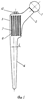 Перед введением ножки и вертельного отдела эндопротеза в обработанные метафизарную зону и костно-мозговой канал бедра ребра должны быть погружены в полость корпуса. Для этого вращением винта устанавливают толкатель в верхнее положение, при котором пружины находятся в сближенном положении и удерживают ребра в полости короба, т.е. в исходном положении. Ножку эндопротеза и его вертельный отдел вводят в заготовленное костное ложе, ориентируя шейку в положение необходимой торсии. Далее, вращением винта в противоположном направлении, перемещают толкатель в нижнее положение. Толкатель оказывает давление на сближенные пружины, разводя их и создавая в них накопление энергии упругой деформации, стремящейся развести пружины, внедряя при этом ребра наружными кромками в метафизарную губчатую костную ткань проксимального отдела бедра. Ориентируясь на прочность посадки эндопротеза, хирург устанавливает толкатель в нижнем положении на том или ином уровне.