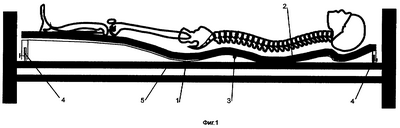 При наличии спрямленного лордоза в первое время лежание на ложе может вызвать болезненные ощущения. Для предотвращения болей и постепенного увеличения поясничного изгиба до нормального (с учетом разности полноты тел пациентов), используют шарнирное соединение 5 в области центра поясничного лордоза и механизм 2 изменения высоты, размещенный у черепного конца верхней подушечной части основания 1.