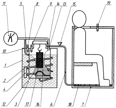 В емкости 2 за счет подачи воздуха от компрессора 11 через отверстие 10 к змеевику 12 создается избыточное давление, при этом воздух и сетка 16 приводят к барботажу воды (в дальнейшем приготовляемого раствора экстракта). Распыленная до молекулярного состояния вода в виде тумана окутывает подвешенный контейнер 17 с пантами и переводит легкорастворимые биологически активные вещества пантов в раствор-экстракт. Такой процесс в емкости 2 продолжается в течение 2-10 минут в зависимости от массы пантов, после чего кран (не показан) для подачи нагретого раствора экстракта открывается и мелкодисперсный лечебный экстракт по трубопроводу 6 и через отверстие 18 трубы 10 поступает в ванну 7, окутывая пациента. При этом температура в ванне 7 контролируется датчиком 19 и поддерживается на уровне 42,8°С (±2°С) автоматически подачей воздуха от компрессора 11 через отверстие 10 и змеевик 12 и через отверстие 13 к трубке 14, размещенной в емкости 2, и далее через отверстие (не показано) в трубопровод 6 и перфорированную трубу 18 ванны 7.