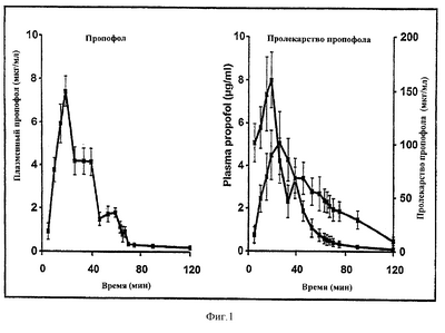 Фигура 1 показывает средние измеренные плазменные концентрации пропофола, полученные на основе запрограммированных вливаний пропофола (левая панель) и на основе вливаний двунатриевой соли о-фосфонооксиметил-пропофола (“пролекарства”; правая панель) у людей. Это исследование проводилось на девяти мужчинах-добровольцах, чтобы продемонстрировать пригодность вливания водного раствора двунатриевой соли о-фосфонооксиметил-пропофола для индукции и поддержания состояния общей анестезии.