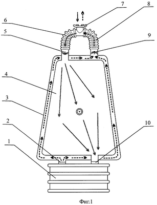 Однако аппарат по предложенному второму варианту также характеризуется не достаточно эффективным снижением температуры вдыхаемой дыхательной смеси, что также подтверждается введением в клапанную коробку аппарата теплообменника. Кроме того, предложенная компоновка дыхательных емкостей не исключает срабатывания клапана избыточного давления при неполном заполнении емкости вдоха. Также как и в первом варианте возможна ситуация, при которой при росте сопротивления регенеративного патрона будет наполнена емкость выдоха и сработает клапан избыточного давления, но при этом наполнения емкости вдоха не произойдет. Неполное заполнение емкости вдоха в данном случае обусловлено воздействием внутреннего давления лишь на две ее противоположные стенки. Последнее также как и в первом варианте может привести к росту сопротивления дыханию, нехватке дыхательной смеси на вдох и выключению пользователя из аппарата. Как и в первом варианте небольшой объем емкости выдоха приводит к увеличению сопротивления выдоху, так как лишь меньшая доля выдыхаемой дыхательной смеси идет на наполнение данной емкости, основной же приходится преодолевать сопротивление регенеративного патрона.