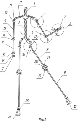 Отрезок проволоки, формирующий стопу 10, на одном конце загибается в вертикальной плоскости в петлю 23, в эту петлю входит незамкнутая петля 26 голени 9 и поджимается, образуя голеностопное сочленение. Другой конец проволоки, являющийся продолжением петли 23 в горизонтальной плоскости и перпендикулярный ей, формирует петлю 24, длина которой соответствует длине ступни. Узкая часть петли 24 расположена у нижней части петли 23. Далее проволока выгибается вертикально вверх в плоскости, перпендикулярной плоскости петли 24, загибается вертикально вниз, проходя перед петлей 23, охватывая переднюю ее часть, образуя петлю-стопор 25, которая проходит перед голеностопным сочленением и препятствует пригибанию сочленения в нефизиологическое положение, вперед к голени.