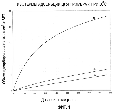 В течение последних трех десятилетий адсорбционные способы выделения кислорода и азота из воздуха все шире используются в промышленности. Потребности в кислороде, который применяют для обработки стоков, ферментации, резки и сварки, разведения рыб, в электрических печах, для отбеливания пульпы, выдувания стекла, для медицинских целей и в сталелитейной промышленности, особенно когда требуется чистота от 90 до 95%, удовлетворяются по большей части применением адсорбции, основанной на способах с колебаниями давления или способах с колебаниями вакуума. По подсчетам в настоящее время 4-5% мировой потребности в кислороде удовлетворяется адсорбционным разделением воздуха. Однако максимальная чистота кислорода, которая достигается адсорбционными способами, составляет около 95%, причем необходимость отделения 0,934 мол.% аргона, присутствующего в воздухе, является лимитирующим фактором для получения кислорода 100% чистоты. Кроме того, производство кислорода из воздуха, основанное на адсорбции, не может экономически конкурировать с криогенным фракционированием воздуха для производства кислорода в объемах более 100 тонн в день. При оценке общих затрат на производство кислорода адсорбционными способами подсчитано, что капитальные затраты на оборудование и потребление энергии являются двумя главными факторами, влияющими на суммарные затраты, составляя 50 и 40%, соответственно. Наряду с такими факторами, как способ и конструкция системы, адсорбент является ключевым компонентом, который может снизить стоимость производства кислорода способом адсорбции. Селективность адсорбента и его адсорбционная емкость являются важными параметрами для определения размеров емкостей для адсорбции, компрессоров или вакуумных насосов. Желательно иметь адсорбент, который обладает высокой адсорбционной емкостью, а также селективностью для азота, сравнимой с селективностью для кислорода. Улучшение данных свойств адсорбента непосредственно приводит к снижению количества адсорбента в системе и, следовательно, уменьшению размеров и расхода энергии воздушного компрессора или вакуумного насоса. Кроме того, адсорбент, селективность которого для азота и аргона выше, чем для кислорода, можно использовать для производства кислорода высокой степени очистки (>96%) из воздуха. Следовательно, очень желательно, чтобы адсорбент обладал хорошей адсорбционной емкостью и селективностью в отношении конкретного компонента, который отделяют.