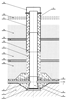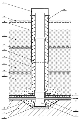На территории полигона ТБО подготавливают основание 1, на которое укладывают противофильтрационный экран 2. Монтируют распределенные по площади полигона фундаменты 3 с обеспечением герметичности противофильтрационного экрана. На каждом фундаменте 3 оборудуют колодец дренажный 4 с открытым верхним концом и фильтрующей обсыпкой 5. Над экраном 2 в основании полигона ТБО укладывают горизонтальные трубчатые дрены 6, примыкающие к дренажным колодцам 4 и предназначенные для отвода фильтрата. Ствол каждой скважины вертикального газового дренажа набирают звеньями 8, 9 из труб с перфорированными стенками и наращивают по мере формирования слоев отходов, при этом нижнее звено 8 присоединяют к открытому верхнему концу дренажного колодца 4. Вокруг ствола скважины устраивают фильтрующую обсыпку 10 при помощи скользящей опалубки 11, представляющей собой отрезок трубы большого диаметра, верхний конец которой перекрывается съемным колпаком-заглушкой 12. После укладки очередного слоя уплотненных отходов 13, его перекрывают изолирующим грунтовым слоем 14, затем выполняют наращивание скважины вертикального газового дренажа: снимают колпак-заглушку 12, монтируют очередное звено трубы 9, приподнимают опалубку 11 на высоту наращивания, в кольцевое пространство между звеном 9 ствола скважины и опалубкой 11 засыпают материал фильтрующей обсыпки 10, устанавливают на верхнем конце скользящей опалубки и герметично уплотняют колпак-заглушку 12.