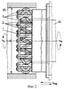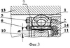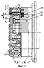 Деформирующая цилиндрическая пружина 1 расположена по окружности и свободно установлена торцом в не вращающемся сепараторе 2, удерживающем пружину от проворота относительно продольной оси. Сепаратор 2 состоит из трубы 3 с фланцем, с помощью которого сепаратор неподвижно закреплен на корпусе 4 привода устройства, наружных 5 и внутренних 6 шпилек и кольца 7. Шпильки 5 и 6 (взяты, например, по ГОСТ 22032-76 – ГОСТ 22041-76) ввернуты в торец трубы 3 и служат для предварительной ориентации витков пружины 1 и удерживании ее в не подвижном состоянии. На шпильки 5 и 6 натянуты резиновые трубки 8 для амортизации ударов со стороны витков пружины. Шпильки расположены между витками кольцевой пружины и их количество равно количеству витков. Свернутая в кольцо деформирующая пружина 1 свободно установлена на шпильках 5 и 6 и одним торцом контактирует с трубой 3, а с другого торца удерживается от выпадения кольцом 7, которое также установлено на шпильках и закрепляется гайками 9.