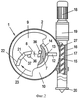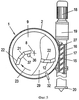 Вариант выполнения согласно фигурам 4 и 5 отличается от варианта выполнения на фигурах 1 и 2 прежде всего тем, что дополнительные инструменты 12 подвешены без возможности совершения маятниковых движений, они неподвижно закреплены на дополнительном несущем диске 21, который расположен соосно несущему диску 9 и приводится во вращательное движение через тот же вал 4. В результате ротор 7 можно выполнить более узким или полностью отказаться от него, выполнив его в виде продолжения вала 4. Как и в варианте выполнения на фигурах 1, 2, нижние инструменты 12 располагаются на уровне выпускного отверстия 15 емкости 1 для того, чтобы можно было эффективно подавать находящуюся в пространстве 10 обработанную пластмассу в питающее отверстие 27 корпуса 16 шнека.