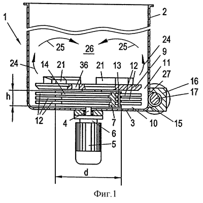 В варианте выполнения, представленном на фигурах 1 и 2, устройство содержит приемную емкость 1, предназначенную для обрабатываемой, в частности термопластичной, пластмассы, подаваемой в емкость 1 сверху с помощью не показанного транспортного устройства, например ленточного транспортера. Подаваемая пластмасса может быть предварительно измельчена и/или предварительно просушена. Приемная емкость 1 выполнена в форме горшка с вертикальными боковыми стенками 2 и содержит плоское днище 3 круглого сечения. Через днище 3 герметично пропущен вал 4, содержащий вертикальную ось 8, совмещенную с осью емкости. Вал 4 приводится во вращение расположенным под днищем 3 двигателем 5 с редуктором 6. Внутри емкости 1 с валом 4 соединены с вращательным замыканием ротор 7 и расположенный над ним несущий диск 9. Ротор 7 образован элементом в виде кругового цилиндра, размер h которого по оси существенно превышает размер плоского несущего диска 9, а радиальный размер d существенно меньше радиального размера несущего диска 9. За счет этого под несущим диском 9 создается свободное пространство 10, свободно сообщающееся по ходу потока обработанного материала с расположенным над несущим диском 9 пространством 26 емкости 1 через кольцевую щель 11, выполненную между периферией несущего диска 9 и боковой стенкой 2 емкости 1. Через эту свободную кольцевую щель 11 обработанная пластмасса беспрепятственно может поступать из пространства 26 в кольцевое пространство 10. Несущий диск 9 содержит на своей покровной поверхности прочно закрепленные инструменты 21, размешивающие, и/или измельчающие, и/или нагревающие находящийся в пространстве 26 емкости 1 материал. Для эффективного измельчения инструменты 21 снабжены режущими кромками 22, которые могут быть изогнуты или отогнуты под углом (фиг.2) навстречу направлению вращения несущего диска 9 (показано стрелкой 23) для обеспечения непрерывного резания. В рабочем режиме при вращении несущего диска под действием инструментов 21 происходит вращение поступившей в емкость 1 пластмассы, при этом обработанный материал перемещается вверх в пространстве 26 по боковой стенке 2 емкости 1 (стрелка 24) и в зоне расположения оси емкости снова падает вниз (стрелка 25). Образующийся при этом смесительный вихрь перемешивает загруженный материал, в результате чего достигается положительный эффект перемешивания. Незначительная доля поступившего в емкость 1 и при необходимости измельченного в ней материала поступает через кольцевую щель 11 в расположенное под несущим диском 9 пространство 10 и подвергается там обработке дополнительными инструментами 12, закрепленными на роторе 7 вертикальными болтами 13 в кольцевых выемках 14 ротора с возможностью поворота, в результате чего эти инструменты способны совершать свободные маятниковые движения вокруг осей болтов 13. Свободные концы инструментов 12 располагаются на некотором расстоянии от боковой стенки 2 емкости 1. Своим ударным действием эти дополнительные инструменты 12 обеспечивают дополнительное перемешивание, и/или измельчение, и/или нагрев находящегося в пространстве 10 материала. Под действием центробежной силы, производимой инструментами 12 и воздействующей на материал, последний поступает в выпускное отверстие 15 емкости 1, расположенное на уровне дополнительных инструментов 12 и сообщающее пр