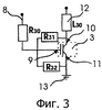 В другом варианте осуществления настоящего изобретения (фиг.3) схема состоит из резистора R30, запитываемого от источника 8 пусковых сигналов постоянного тока, транзистора 10, двух резисторов R31, R32, соединенных друг с другом параллельно, которые, в свою очередь, соединены с упомянутым резистором, и корпуса 13, который соединяет вышеупомянутые компоненты с заземлением.