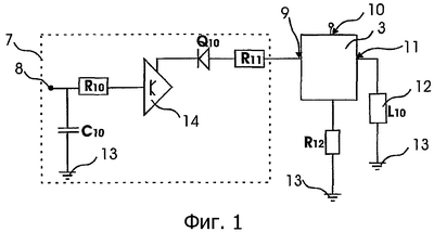 Задающий участок схемы и модуль работают в соответствии с циклической структурой заземления. Для получения 100%-ного соответствия работе реле в технологии автомобилей/транспортных средств ввод задающего участка и положительного одностороннего периодического изменения относительно корпуса 13 осуществляется через поляризацию n-p-n-транзистора.