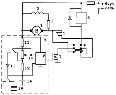 Система управления электродвигателем стеклоочистителя содержит электродвигатель 1 постоянного тока параллельного возбуждения, подключенный к плюсовому проводу бортовой сети автомобиля, в цепь обмотки 2 возбуждения которого включен добавочный резистор 3, двунаправленный переключатель 4 режимов работы на три положения и концевой выключатель 5, первый вывод которого соединен с минусовым выводом якоря двигателя 1 постоянного тока и цепью обмотки 2 возбуждения, реле 6 переключения режимов работы, силовой ключ 7, генератор 8, содержащий таймер 9, переменное сопротивление 10, первое 11 и второе 12 постоянные сопротивления, диод 13, первый 14 и второй 15 конденсаторы, причем первый вывод обмотки реле 6 переключения режимов работы подключен к плюсовому проводу бортовой сети автомобиля, в первом и втором положении переключателя 4 режимов работы, первый вывод силового ключа 7 соединен с минусовым выводом якоря двигателя 1 постоянного тока и цепью обмотки 2 возбуждения, а второй его вывод соединен с минусовым проводом бортовой сети, вход управления силового ключа 7 соединен с выходом генератора 8, в первом положении переключателя режимов работы второй вывод обмотки реле 6 переключения режимов работы и второй вывод концевого выключателя 5 соединены с минусовым проводом бортовой сети, первое постоянное сопротивление 11 подключено к первому выводу переменного сопротивления 10, второй вывод которого соединен с вторым постоянным сопротивлением 12 и нормально замкнутым контактом первой группы реле 6 переключения режимов работы, а его подвижный контакт – с первым входом таймера 9 и переключающим контактом первой группы реле 6 переключения режимов работы, нормально разомкнутый контакт которой соединен с анодом диода 13, катод которого связан с вторым выводом второго постоянного сопротивления 12, вторым входом таймера 9, первым конденсатором 14 и через нормально замкнутые контакты второй группы реле 6 переключения режимов работы – с вторым конденсатором 15, вторые выводы первого 14 и второго 15 конденсаторов соединены с минусовым выводом питания таймера 9 и с минусовым проводом бортовой сети, первый вывод первого постоянного сопротивления 11 подключен к плюсовому выводу питания таймера 9 и к плюсовому проводу бортовой сети автомобиля.