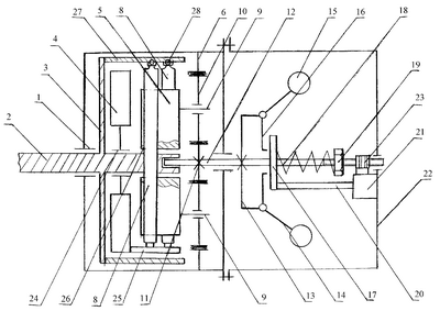По завершении торможения угловые скорости диска 3 с барабаном 27 и инерционного маховика 4 выравниваются, фрикционная лента 8 разобщается с ведомым маховиком 5, уменьшается угловая скорость вращения рычажно-кулачкового центробежного механизма, приводимого в движение планетарным механизмом. Система возвращается в исходное положение.