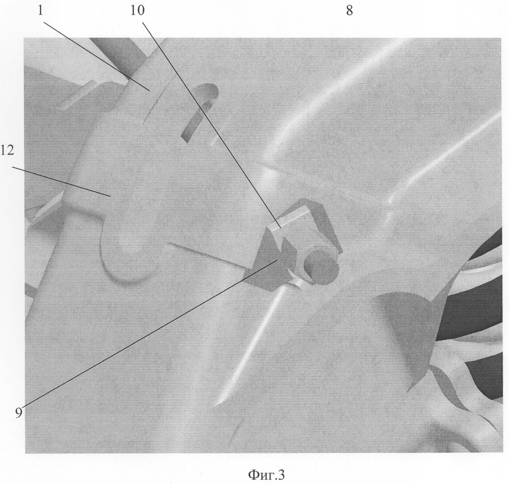 Диагональные связи состоят из четырех попарно соединенных в центральной части тележки стержней 2 с помощью пластины 3 и осей 4 (Фиг.2). Пластина 3 (Фиг.2) имеет четыре диагонально расположенных вытянутых отверстия с симметричными закруглениями 5. Каждое такое отверстие сверху и снизу армировано накладками 6. В зоне соединения с пластиной каждый стержень оснащен С-образной вилкой 7 с цилиндрическими отверстиями по диаметру осей 4. На другом конце стержня 2 выполнена резьба, которая с помощью гайки 8 (Фиг.3), клиновой шайбы 9 и стопорной шайбы с лапкой 10 позволяет зафиксировать наружный конец стержня 2 в вытянутых отверстиях с симметричными закруглениями 11 (Фиг.4), расположенных во внутренних и наружных вертикальных стенках нижнего пояса боковой рамы 1. Боковая рама 1 в зоне отверстий 11 имеет усиления 12, обеспечивающие необходимую прочность нижнего пояса.