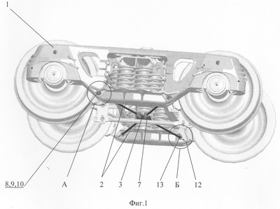 На каждый стержень 2 (Фиг.5) с внутренней стороны боковой рамы 1 тележки надета шайба 13, которая устанавливается вплотную к вертикальной стенке нижнего пояса боковой рамы и приваривается к стержню. Шайба ограничивает осевое перемещение той диагональной связи, которая при вписывании вагона в кривые участки пути находится в сжатом состоянии. Отсутствие изгибающих моментов в сжатой диагонали обеспечивается перемещением соответствующих осей 4 (Фиг.2) в вытянутых отверстиях с симметричными закруглениями 5 пластины 3.