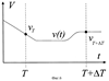 Движение поездов и изменение состояния объекта в интервале AT моделируется как непрерывная функция. Таким образом реализуемая модель является дискретно-непрерывной, что показано на фиг.6. Скорость (t) движения поезда задается по соответствующим командам в моменты синхронизации Т и Т+ Т. В интервале между моментами синхронизации осуществляется независимое моделирование движения одного из поездов, движущихся по участку, определяемое наличием и количеством событий внутри интервала синхронизации. Такое моделирование позволяет отследить изменение скорости поезда в течение интервала T, которая в моменты синхронизации имела одинаковые значения.