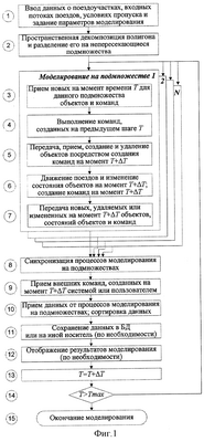 Принимают данные от процессов моделирования на указанных подмножествах (позиция 10). Результаты моделирования сохраняют в базе данных и, если необходимо, на каком-либо другом носителе (позиция 11). При этом необходимо отметить, что шаг сохранения модели может не совпадать с T. Отображают результаты (позиция 12). Далее переходят к интервалу времени, следующему за моментом Т+ Т (позиция 13) и, если время моделирования не превысило максимума (позиция 14), вновь осуществляют моделирование на подмножествах, возвращаясь к стадии начала моделирования на подмножествах (позиция 3). В противном случае завершают моделирование (позиция 15). При этом возможно остановить моделирование и вернуться к произвольно выбранному более раннему циклу.