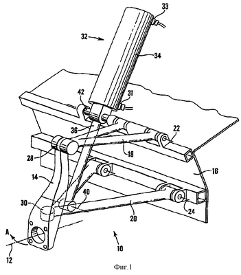 Как показано на фиг.1 и 2, система подвески для колеса 8 автомобиля-амфибии обозначена в целом позицией 10. Колесо 8 установлено с возможностью вращения вокруг оси 12 моста (не изображен), которая установлена обычным образом на стойке 14 кронштейна колеса. Верхний рычаг 18 управления и нижний рычаг 20 управления поддерживают стойку 14 кронштейна колеса относительно корпуса 16 автомобиля. Рычаги 18, 20 управления находятся на одной линии на расстоянии друг от друга и установлены с возможностью поворота на корпусе 16 автомобиля вокруг соответствующих параллельных осей 22, 24. Это известно как двойная система подвески рычажного типа.