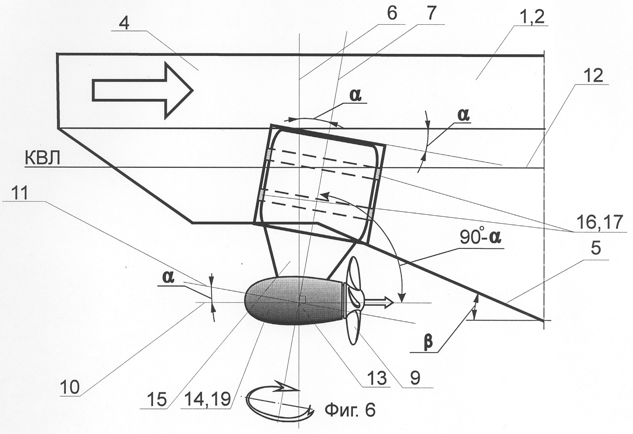 23. Главная двигательная установка судна по п.19, отличающаяся тем, что в случае нелинейного наклона поверхности днища оконечности судна углом наклона поверхности днища к плоскости контура ватерлинии судна принят угол между плоскостью контура ватерлинии судна и касательной плоскости к поверхности днища в точке ее усредненного наклона.