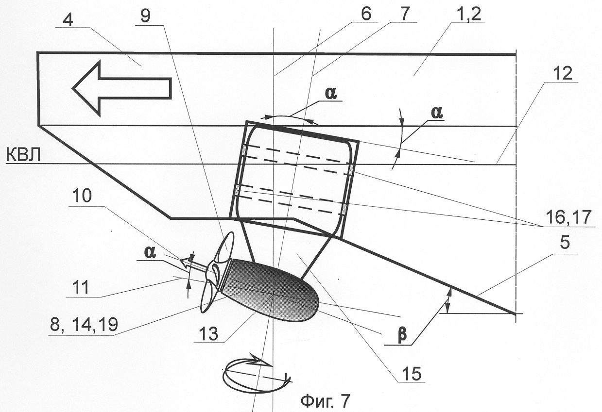 Угол между осью вектора тяги 10 движителя 9 и поворотной осью 7 установки 8 движительного узла 15 составляет 90°- , вектор тяги движителя 9 направлен в сторону от поворотной оси 7 главной двигательной установки 8.