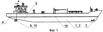 Судно 1 выполнено в виде танкера ледового класса и содержит от 8 до 16, предпочтительно 10 грузовых и не менее 2 отстойных танков (на чертежах не показано), при этом корпус 2, по крайней мере, в зоне размещения грузовых танков (на чертежах не показано) выполнен с двойным дном и двойными бортами (на чертежах не показано) с ледовым усилением (на чертежах не показано).