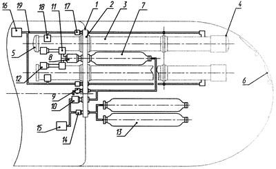 Подводная лодка имеет прочный корпус 1 и легкий корпус с волнорезными щитами 6. В переборку прочного корпуса ПЛ на одном переборочном стакане 2, выполненном в виде плиты с отверстиями, установлены торпедные аппараты 3 с передней 4 и задней 5 крышками, а также боевой баллон 7, герметично подсоединенный к отверстию комингса вне прочного корпуса ПЛ. Внутри прочного корпуса, на этом же отверстии комингса установлен боевой клапан 8. Другая горловина боевого баллона связана трубопроводом с клапаном продувания 9 и клапаном наполнения 10. Боевой клапан связан трубопроводом с отсечными клапанами 11 и далее с невозвратными клапанами 12, установленными на казенных частях ТА. Группа забортных баллонов ВВД 13, расположенная вне прочного корпуса, соединена трубопроводом с запорным клапаном 14, который установлен на переборочном стакане и связан с корабельной системой ВВД 15 и клапаном наполнения 10, связанным с группой забортных баллонов ВВД 13, которая составляет автономный запас воздуха для работы ТА. Для заполнения ТА водой предусмотрена система заполнения-осушения 16, которая через передний клапан осушения 17 и задний клапан осушения 18 связана трубопроводами 19 с ТА. Клапаны и трубопроводы продувания ТА, входящие в состав системы заполнения-осушения давления, на чертеже не показаны.