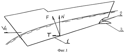 В качестве прототипа нами выбрано устройство, использующее энергию волны для создания тяги [3], представляющее собой дополнительное дно в виде наклонной поверхности в районе носовой оконечности судна 1 (фиг.1). При качке судна на волнении возникающая сила F имеет две составляющие: силу N, уменьшающую амплитуду качки, что благоприятно сказывается на условиях обитания экипажа, и силу Т – дополнительную тяговую силу, которая в случае работы главного двигателя уменьшает его напряженность, снижая температуру охлаждающей воды, и тем самым увеличивает моторресурс главного двигателя. Все это приводит к значительному экономическому эффекту. Кроме этого, при аварийной ситуации (в случае посадки судна на мель) дополнительное дно позволит предотвратить разрушение основного дна и поступление воды внутрь корпуса судна.