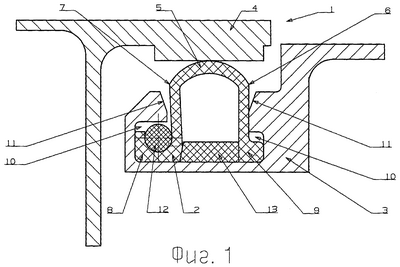 Устройство герметизации 1 включает профиль герметизации 2, желоб окантовки 3 и крышку 4. Профиль герметизации 2 выполнен П-образным, с выпуклой верхней частью 5 переменной жесткости (толщины), ограниченной двумя ребрами 6 и 7, в месте сопряжения выпуклой верхней части 5 с лапками 8 и 9. Лапка 8 выполнена с канавкой. Желоб окантовки 3 выполнен в виде профиля с пазами 10 под лапки 8 и 9 и с расширяющимися скосами 11, которые позволяют при деформации профиля герметизации 2 компенсировать его внутренний объем, для того чтобы не было необходимости производить перепуск воздуха, находящегося во внутреннем объеме профиля герметизации 2. В полости желоба окантовки 3 расположен профиль герметизации 2, а в пазы 10 вставлены лапки 8 и 9. Профиль герметизации 2 зафиксирован в желобе окантовки 3 при помощи фиксирующих элементов – эластичного шнура 12, фиксирующего лапку 8, и распорной пластины 13, распирающей (удерживающей) лапки 8 и 9 в пазах 10 желоба окантовки 3. Крышка 4 выполнена с плоской, прилегающей к профилю герметизации 2, поверхностью.