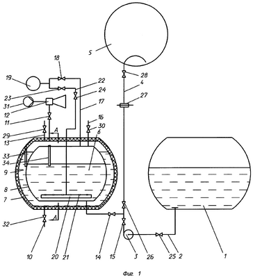 В процессе выдачи переохлажденного кислорода и понижения уровня его во внутреннем сосуде 8 первоначально образованная в сосуде холодная гелиевая подушка опускается с уровнем жидкости, предохраняя переохлажденный жидкий кислород от теплового контакта с теплым газом наддува, что существенно уменьшает объем верхнего слоя жидкого кислорода с температурой выше температуры, заданной на заправку (тепловые остатки незабора жидкого кислорода).