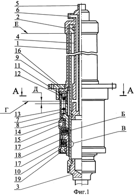 Гидравлический подъемник состоит из силовой рубашки 1, подвижного полого штока 2 с многозаходной несамотормозящейся резьбой и шпоночным пазом снаружи. Полый шток 2 снизу замыкает крышка 3. В верхней части полого штока 2 выполнен бурт, торец “Е” которого служит ограничителем хода полого штока 2. Внутри штока 2 установлен неподвижный шток 4 с поршнем и трубой, разделяющей внутреннюю полость гидроподъемника. Верхняя часть неподвижного штока 4 соединена силовой рубашкой 1 и образует головку с отверстиями 5, 6 для подвода рабочей жидкости в соответствующие полости гидравлического подъемника. На наружную поверхность штока 2 устанавливается опора 7, выполненная в виде втулки с буртом снаружи, по форме представляющим собой кольцевой плунжер 8. На нижнем торце опоры 7 выполнены шлицы, сверху выполнена проточка, в которую устанавливается силовая рубашка 1. Внутри опоры 7 выполнена кольцевая канавка для выхода шпоночного паза и ограничения перемещения шпонки. Аналогично для размещения шпонки и ограничения ее перемещения выполнены в силовой рубашке 1 со стороны торца “Г” шпоночный паз и кольцевая канавка. В совмещенные пазы силовой рубашки 1, штока 2, опоры 7 устанавливается шпонка 9 (фиг.2). На опоре 7 смонтирована обойма 10, в верхней части которой выполнена канавка для установки пружинного кольца 11, предотвращающего выпадение упора 12 от усилия пружины 13. Пружина 13 прижимает опору 7 через регулировочную прокладку 14 к внутреннему бурту обоймы 10 с возможностью перемещения в осевом направлении в пределах зазора “Д”. В середине обоймы 10 выполнено отверстие 15 для подвода рабочей жидкости в полость, образованную между двумя уплотненными буртами обоймы и опоры. Вверху обойма 10 прижата гайкой 16 к торцу бурта силовой рубашки 1. Снизу в обойме 10 между двумя упорными подшипниками 17 установлена гайка 18 для взаимодействия своими торцовыми шлицами со шлицами на торце опоры 7 (фиг.3, 4). Торцовые шлицы опоры 7 и гайки 18, шпонка 9 являются тормозным механизмом винтовой пары штока 2 и гайки 18 (фиг.5), силовой рубашки 1 и штока 2. Подшипники 17, гайка 18 закреплены в обойме 10 резьбовым упором 19.