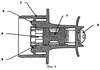Рассмотрим кран, показанный на фиг.1, установленный в сливном отверстии емкости; при нажатии на нажимную кнопку, выполняющую роль средства 5 для приведения в действие приводного узла 4, последний перемещается вместе с клапаном или мембраной 2, преодолевая сопротивление упруго деформирующегося элемента 6, при помощи ползуна, образующего общий направляющий элемент 7. Данное перемещение осуществляется направленно при взаимодействии с общим направляющим элементом 7 при помощи направляющих рельсов 10, встроенных в корпус 1 (фиг.1, 2 и 4).
