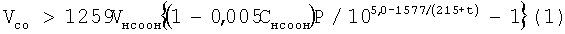 Изобретение относится к способам получения окиси углерода, которая является важным промышленным полупродуктом для производства целого ряда органических и неорганических соединений. Среди многочисленных методов получения окиси углерода для получения окиси углерода высокой чистоты часто используется метод дегидратации муравьиной кислоты в присутствии кислотных катализаторов. Известен жидкофазный способ получения окиси углерода разложением муравьиной кислоты под действием трехкратного избытка концентрированных сильных минеральных кислот, таких как серная и фосфорная (Рапопорт Ф.М. и др. Лабораторные методы получения чистых газов. М.: Госхимиздат, 1963, с.239). Известен ряд способов парофазного разложения (дегидратации) муравьиной кислоты в присутствии гетерогенных катализаторов. Так, в Авторском свидетельстве СССР №880976 описан способ получения окиси углерода разложением муравьиной кислоты в присутствии окиси алюминия при температуре 200-300°С. В Авторском свидетельстве СССР №1033431 описан способ получения окиси углерода разложением муравьиной кислоты при повышенной температуре в присутствии кальцийфосфатных или кальцийборфосфатных катализаторов. В Авторском свидетельстве СССР №1641417 в качестве кислотного катализатора парофазной дегидратации муравьиной кислоты предложено использовать фосфоромолибденовую гетерополикислоту на носителе – силикагеле марки КСКГ. Недостатком известных способов получения окиси углерода разложением муравьиной кислоты является проведение процесса при атмосферном давлении и, соответственно, получение окиси углерода низкого давления (атмосферного или близкого к атмосферному). Поскольку большинство процессов синтеза химических продуктов, базирующихся на использовании окиси углерода, осуществляются при повышенном давлении (15-100 атм), известные способы предполагают дальнейшее компремирование (сжатие) полученной окиси углерода, т.е. применение многоступенчатых компрессоров и, следовательно, дополнительные капитальные вложения и энергозатраты. Целью настоящего изобретения является устранение указанных недостатков. Цель была достигнута путем осуществления процесса дегидратации муравьиной кислоты под давлением (15-100 атм) с получением окиси углерода сжатой до давления, необходимого для ее дальнейшего использования. В процессе разработки предлагаемого способа получения окиси углерода оказалось, что при повышении давления выше определенного предела происходит быстрое снижение активности катализатора и его разрушение. В результате проведенных исследований был найден технологический прием, обеспечивающий стабильную работу катализатора. Результат был достигнут путем рециркуляции части полученной окиси углерода в реактор дегидратации. В результате выполненных систематических исследований было установлено, что степень необходимой рециркуляции окиси углерода зависит от температуры и давления процесса, а также от объемной подачи муравьиной кислоты или ее водного раствора и концентрации раствора муравьиной кислоты. Было установлено, что для стабильной работы катализатора и процесса в целом объемная подача рециркулируемой окиси углерода должна быть не менее определяемой по формуле: где Vco – объемная подача окиси углерода на рециркулицию, определенная при нормальных у