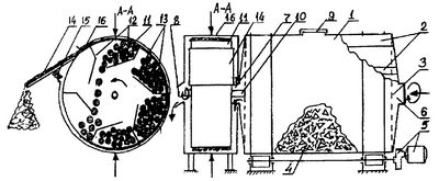 3. Устройство для гальванохимической очистки сточных вод, содержащее цилиндрический барабан, внутри которого расположены полки и сетки с размещенной между ними загрузкой частиц гальванопары, привод, загрузочное и разгрузочное устройства, отличающееся тем, что разгрузочное устройство дополнительно содержит полый барабан из диамагнитного материала, расположенный соосно цилиндрическому барабану и закрепленный с ним на одной оси, внутри которого расположены полки, имеющие изгибы по направлению вращения барабана, при этом барабан на 1/3-1/4 часть своего объема заполнен подвижной сферической магнитной загрузкой, а с наружной стороны барабана размещен подпружиненный скребок, закрепленный на внешнем неподвижном корпусе, окаймляющем барабан с зазором, с возможностью осаждения на внешнюю поверхность полого барабана под действием магнитного поля ферромагнитного осадка и последующего отвода его из аппарата в обезвоженном состоянии.