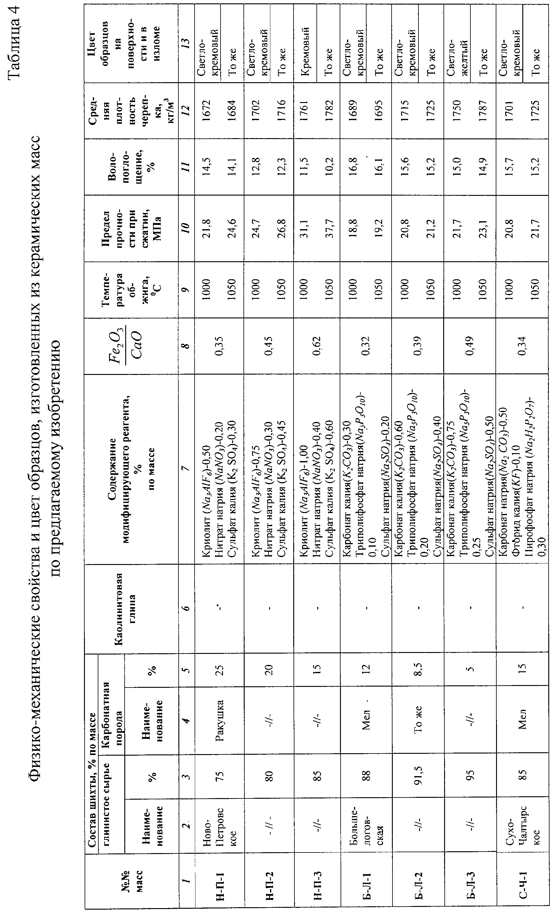 Модифицирующий реагент обладает каталитическим действием, усиливающим осветление черепка в процессе обжига, что позволяет уменьшить содержание карбонатных пород в составе керамической массы в 1,5-4 раза. При указанном соотношении компонентов в массе после обжига получены керамические изделия от светло-кремового до кремового и светло-желтого цвета. При выходе за граничные пределы цель изобретения не достигается. Увеличение содержания карбонатной породы Снижение содержания модифицирующего реагента уменьшает эффект осветления черепка, а увеличение количества реагента более установленного предела приводит к появлению налета на поверхности изделий. Как известно, большинство кирпичных заводов, выпускающих керамический кирпич, использует высокочувствительное к сушке глинистое сырье. С целью устранения трещиноватости в процессе сушки при объемном окрашивании черепка предлагается в состав масс дополнительно вводить до 10% каолинитового или каолинито-гидрослюдистого глинистого сырья. Примеры экспериментальной проверки данного изобретения приведены в таблице 4. Все указанные компоненты модифицирующих реагентов измельчали в шаровой мельнице менее 0,1 мм и добавляли в виде водного раствора или в виде порошка в дисперсную карбонатную породу, после перемешивания осветляющую добавку вводили в состав шихты. Глинистое сырье измельчали менее 1 мм, отощающие добавки просевали сквозь сито с размером отверстий 1,25 мм. Все компоненты шихты увлажняли до 18-19% и формовали образцы – кубы размером 50×50×50 мм. Образцы подсушивали в помещении до влажности 5-6%, далее в сушильном шкафу при температуре 100°С. Обжигали объемноокрашенные образцы в электрической печи при температуре 1000 и 1050°С. Результаты экспериментальных исследований, приведенных в таблице 4, показывают, что введение 0,6-2,0 мас.% модифицирующего реагента позволяет получать черепок от светло-кремового до светло-желтого цвета из керамических масс, имеющих соотношение Fe2О3/СаО=0,32-0,5 (без модифицирующего реагента это может быть достигнуто при соотношении Fe2O3/СаО<0,25). В приведенных примерах показано, что модифицирующий реагент способствует уменьшению содержания карбонатных пород в составе глиномасс в 1,5-4 раза, в результате чего повышается прочность образцов от 5,3-11,7 до 17,1-25,9 МПа, т.е. в 2-3 раза, и снижается водопоглощение с 19,1-24,8 до 13,9-18,0%. Кроме этого модифицирующий реагент расширяет температурный интервал обжига образцов (до 50°С), что позволяет рекомендовать предлагаемый состав массы для промышленного внедрения на действующих керамических предприятиях. На технологических линиях предприятий ОАО «Славянский кирпич» (Краснодарский край) и Ростовского УМГ ООО «Мострансгаз» (г.Ростов-на-Дону) выпущены промышленные партии кирпича из керамических масс с добавкой модифицирующего реагента. Полученные результаты подтвердили эффективность использования предлагаемой керамической массы на действующих предприятиях (см. акты выпуска промышленных партий кирпича и фотографии образцов кирпича, выпущенных из естественноокрашенных глин и керамических масс с добавлением карбонатной породы и модифицирующего реагента). Сопоставление результатов, приведенных в табл. 4, с прототипом показывает, что заявляемый состав керамической массы отличается от известной. Благодаря отличиям достигается 